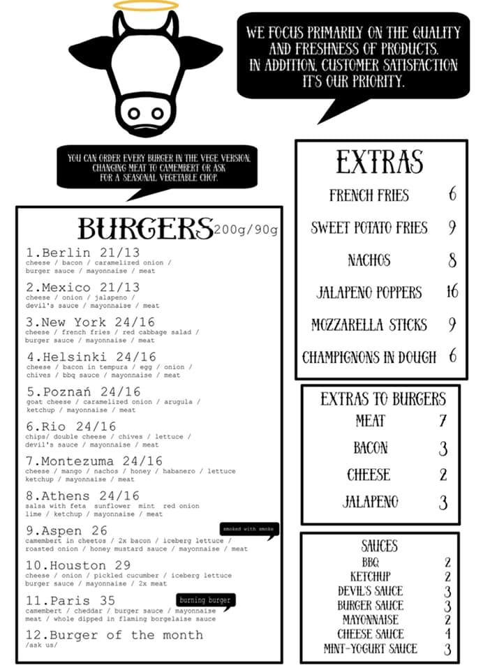 Wolisz prostolinijność, nie lubisz długo czekać na posiłek i mimo to potrzebujesz komfortu i atmosfery? Znajdziesz to wszystko w „Święta Krowa”. Oferujemy Ci pyszne jedzenie zarówno w porze obiadowej, jak i podczas spotkania z przyjaciółmi. U nas skosztujesz pysznych, nieskomplikowanych potraw w wspaniałej atmosferze.